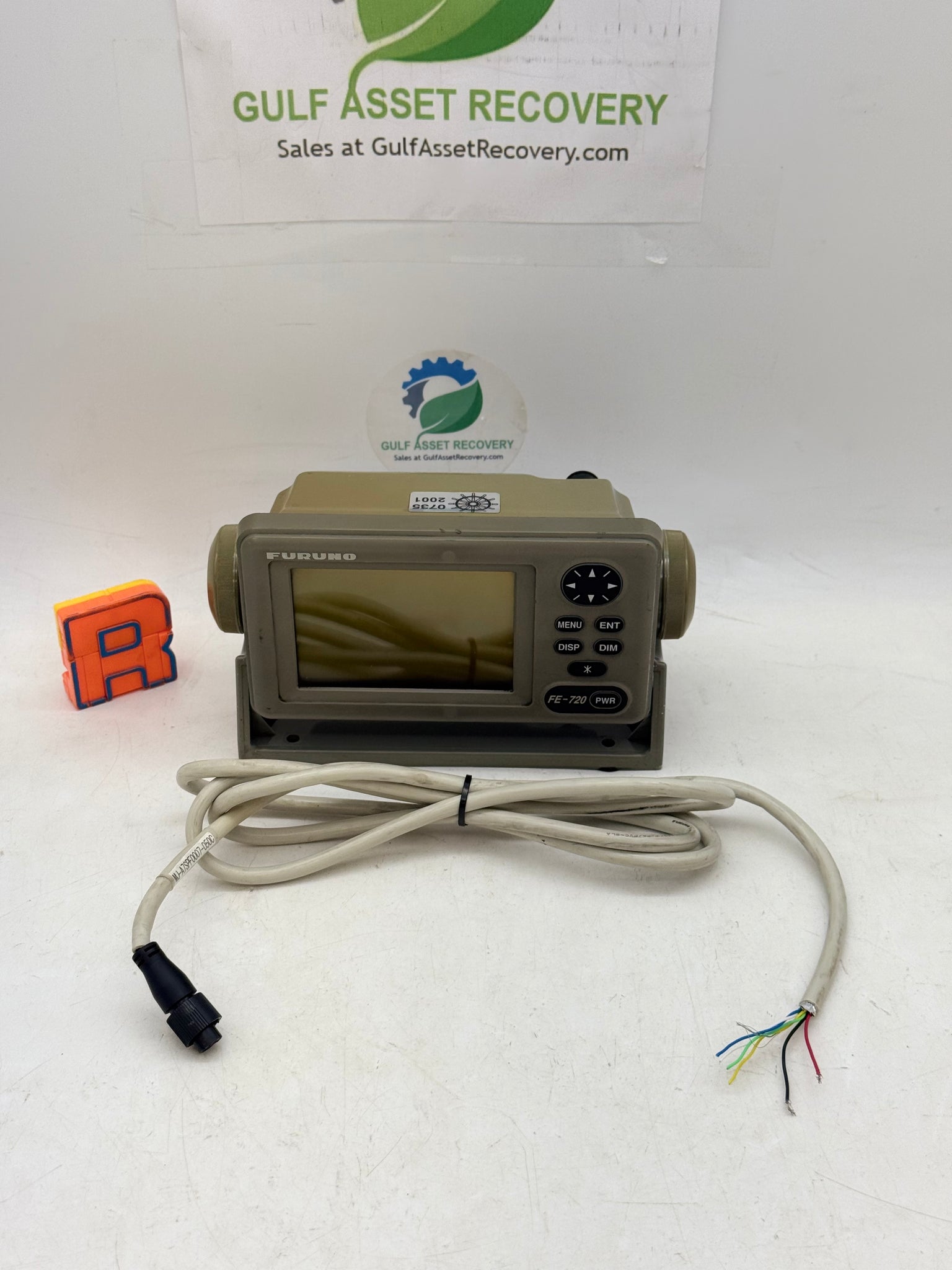 Furuno FE-720 Digital Depth Indicator Display Unit w/ Mounting Bracket and Pictured Power Cable Connection, Used-Screen Shows Streaks so Listed For Parts/Repairs or Not Working-See Pictures