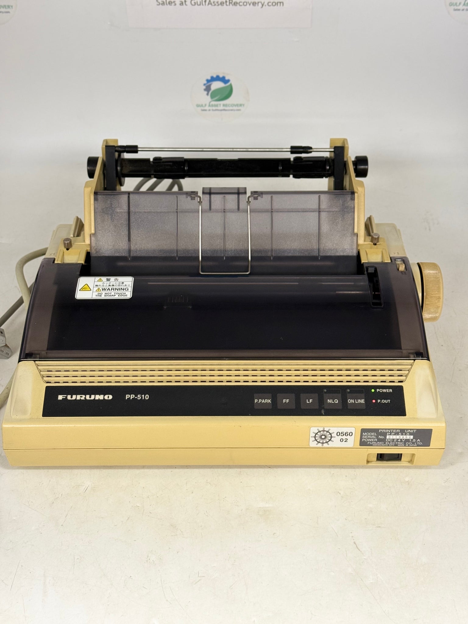 Furuno PP-510 GMDSS Printer Unit w/ Pictured Power Cable, Used-Item Functions Properly and Prints But Nothing Visible On The Paper And Printer Head Did Not Become Hot So Likely The Printer Head Needs To Be Replaced But Not Tested Further So Listed For Parts/Repairs or Not Working-Paper Roll, Power and Data Cables Used For Pictures Only and Is Not Included-Printer Ribbon Included But Is Used and May Need to be Replaced for Better Print Quality-See Pictures
