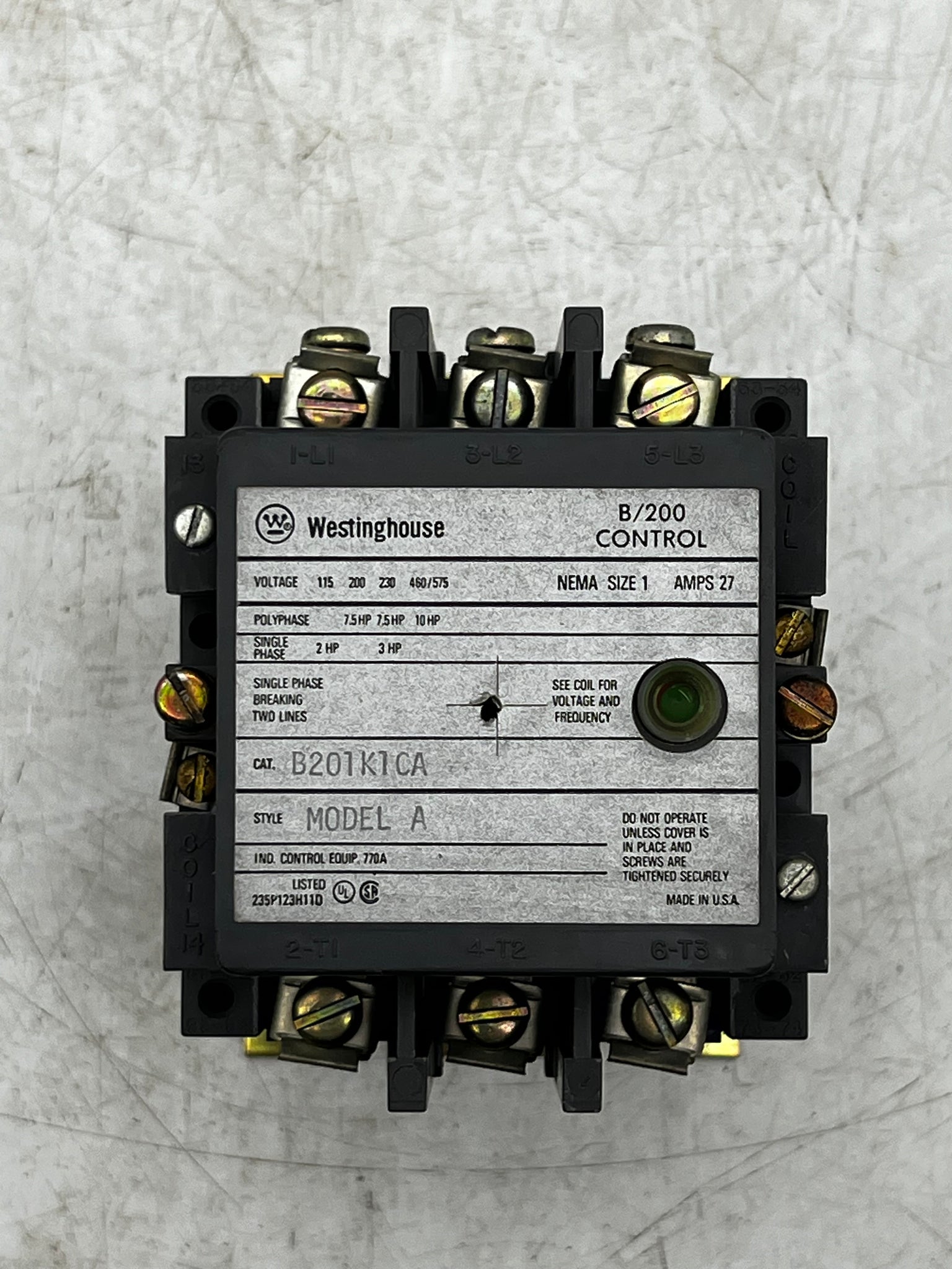 Westinghouse B201K1CA B/200 Control Contactor, Model A, NEMA 1, 27 Amps, Single Phase, Used