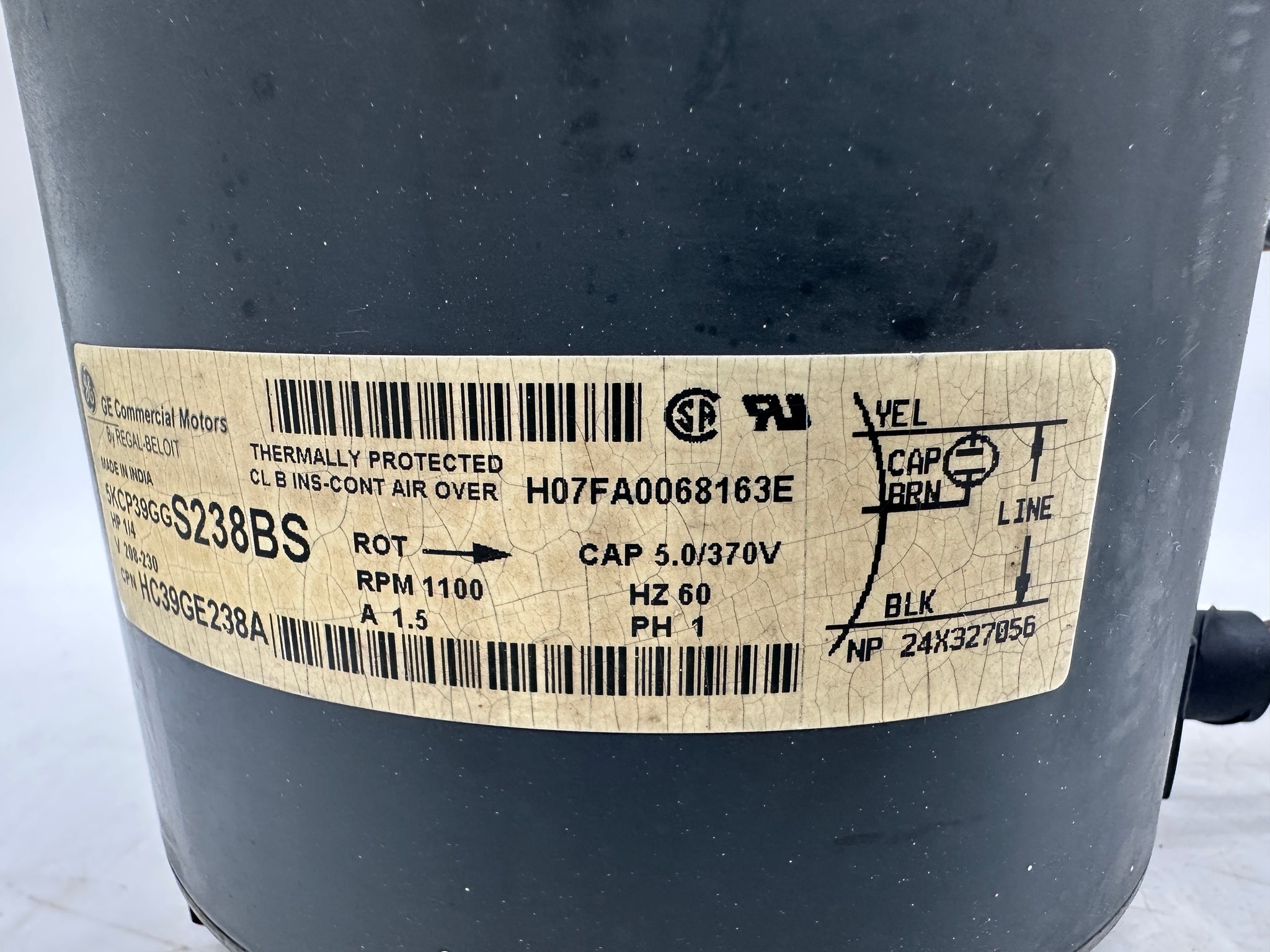 GE General Electric Regal-Beloit 5KCP39GGS238BS Carrier HC39GE238A Condenser Fan Motor, 1/4 HP, 1100 RPM, 208-230VAC, 1.5 A, 60 Hz, Single Phase, Used