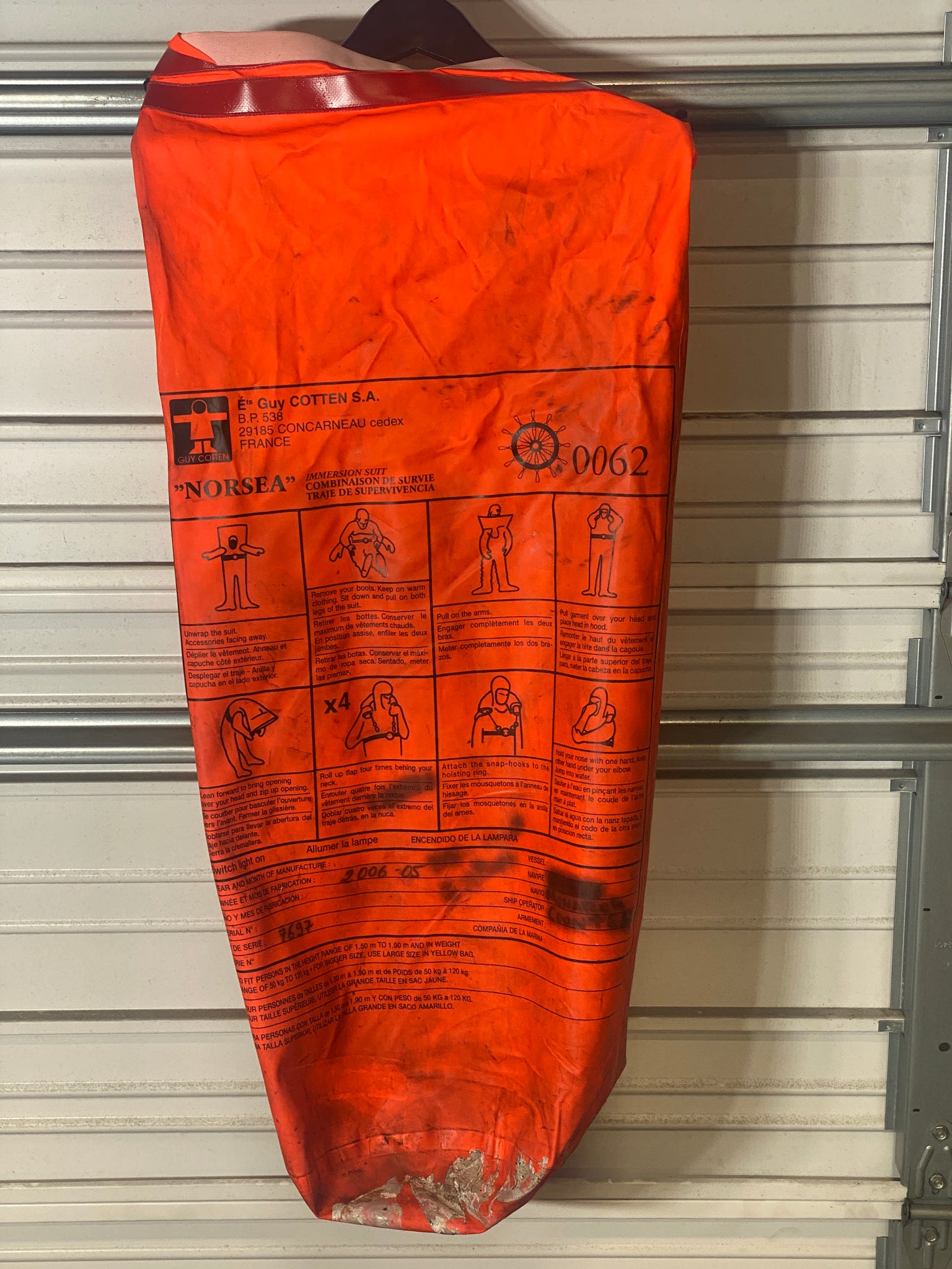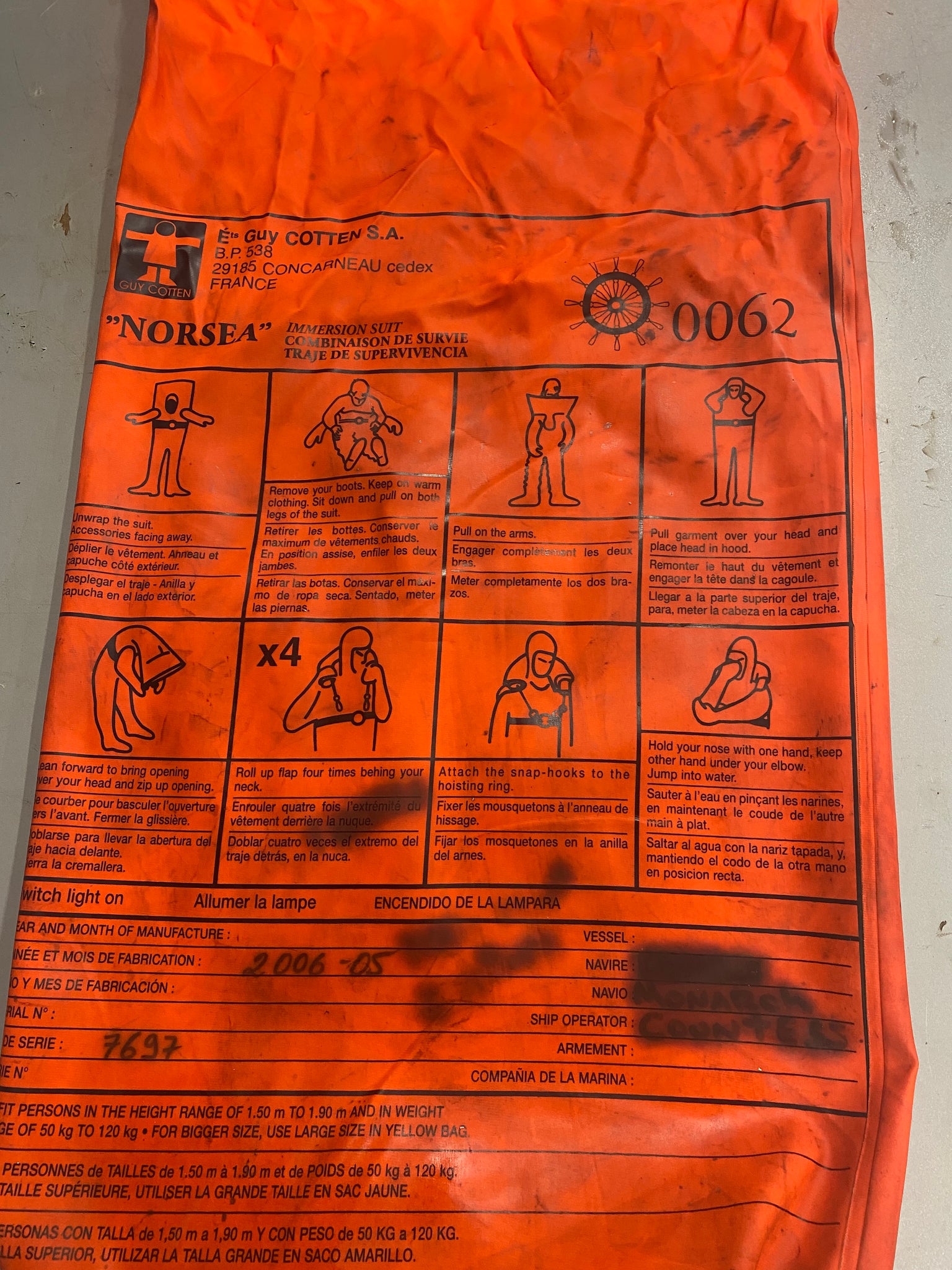 Guy Cotten NORSEA Immersion Suit, Size: Standard, Height Range: 1.50m-190m (5'-6'2"), Weight Range: 50kg-120kg (110lb.-260lb.), Unused-Pre-Owned-Suit/Suit Bag May Show Signs of Wear From Storage-Item May Have A Name Stenciled on Bag/Suit - See Pictures