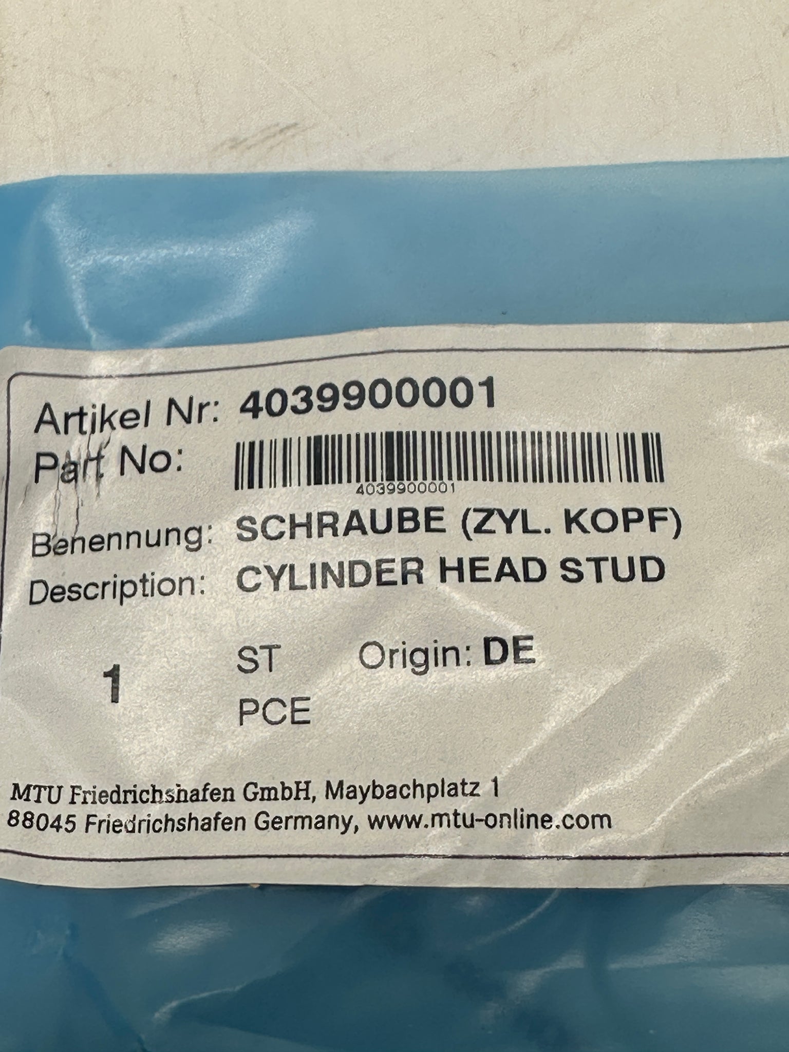MTU Mercedes-Benz 4039900001 Cylinder Head Stud 15x2x168mm *Bag of (6)* (Open Box)
