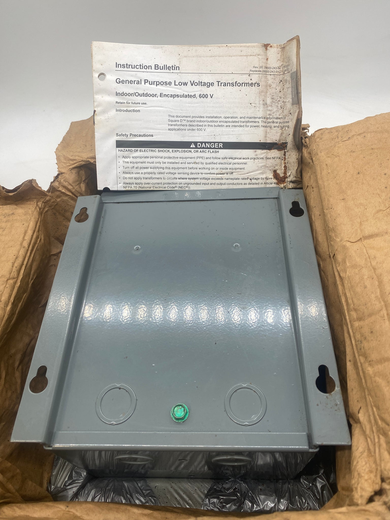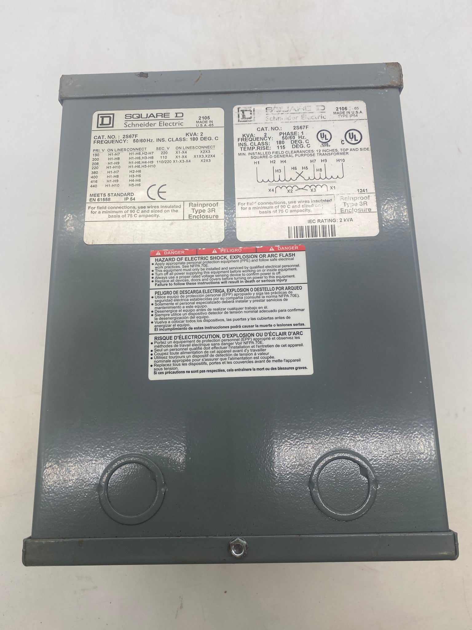 Square D 2S67F KVA-2 General Purpose Transformer, 50/60Hz, Single Phase, Rainproof Type 3R Enclosure, Primary: 220 x 440VAC, Secondary: 110/220VAC, New-Open Box-Box May Show Signs of Wear From Storage-See Pictures