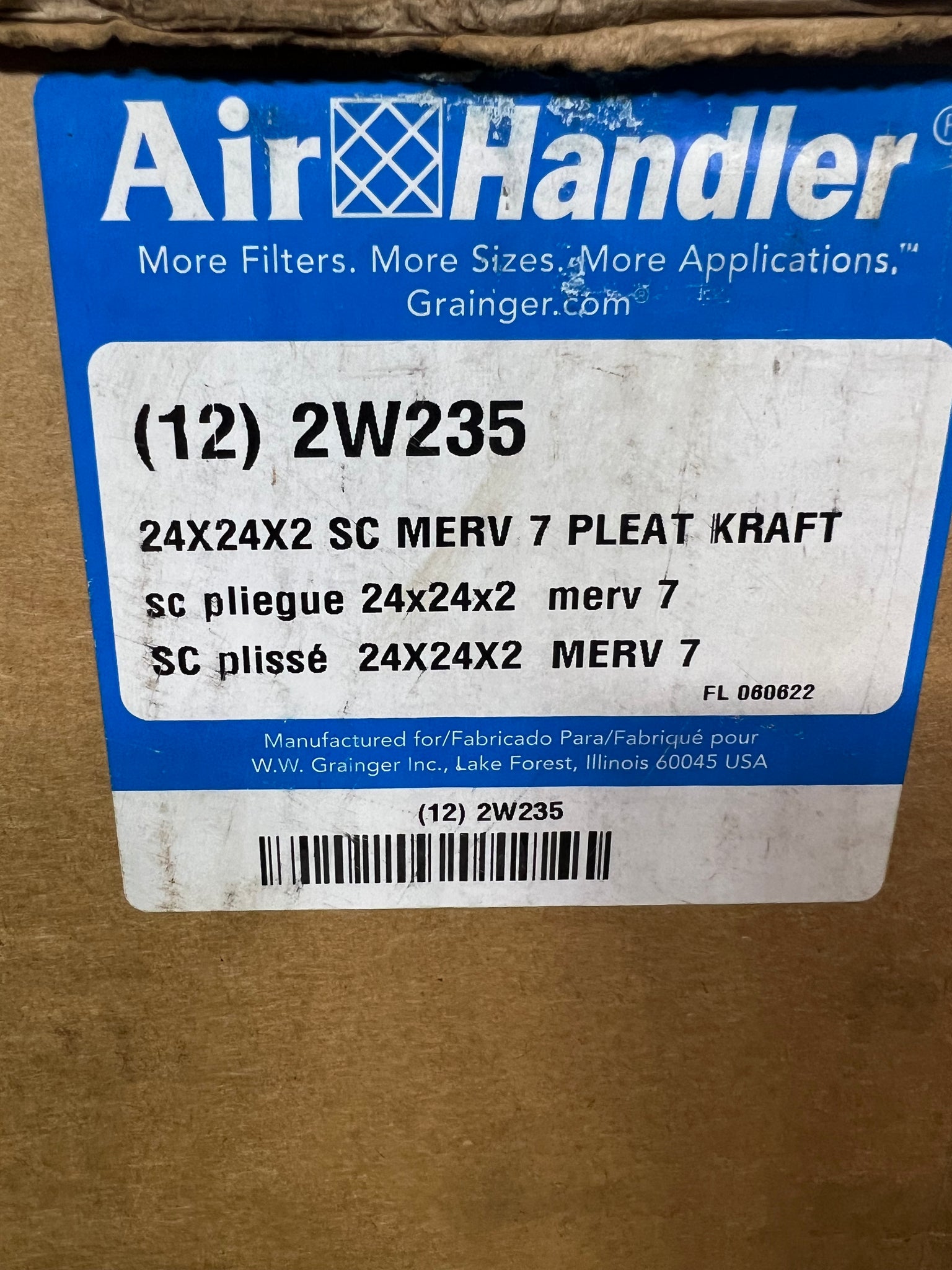 Air Handler 2W235 Pleated Air Filter, 24"x24"x2", MERV 7, Standard Capacity, Synthetic Media Material, *Box of (12)*, New