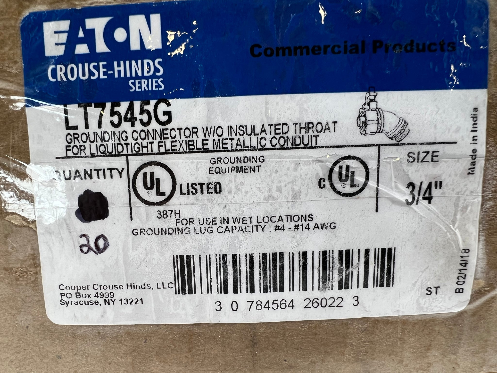 Eaton Crouse-Hinds LT7545G Liquidtight 45 Degree Elbow Connector w/o Insulated Throat w/ Grounding Lug, 3/4", *Box of (20)*, New-Open Box - Item/Box May Show Wear From Storage-See Pictures