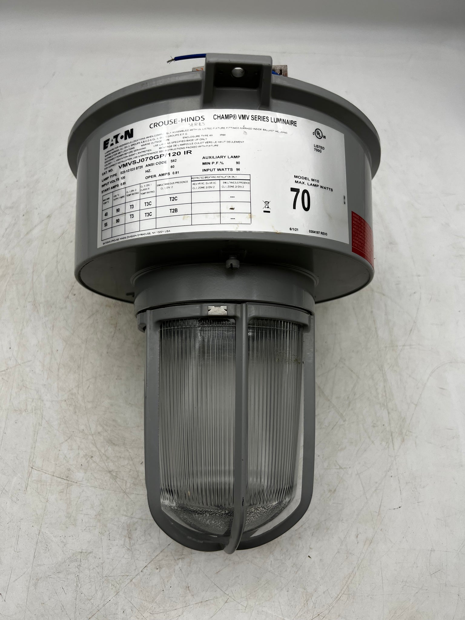 Eaton Crouse-Hinds Champ VMVSJ070GP/120-IR Champ VMV Series Luminaire for Hazardous Locations, 3/4" Hub, Stanchion Mounted, Instant Restrike, Used-For Parts-*No Base*