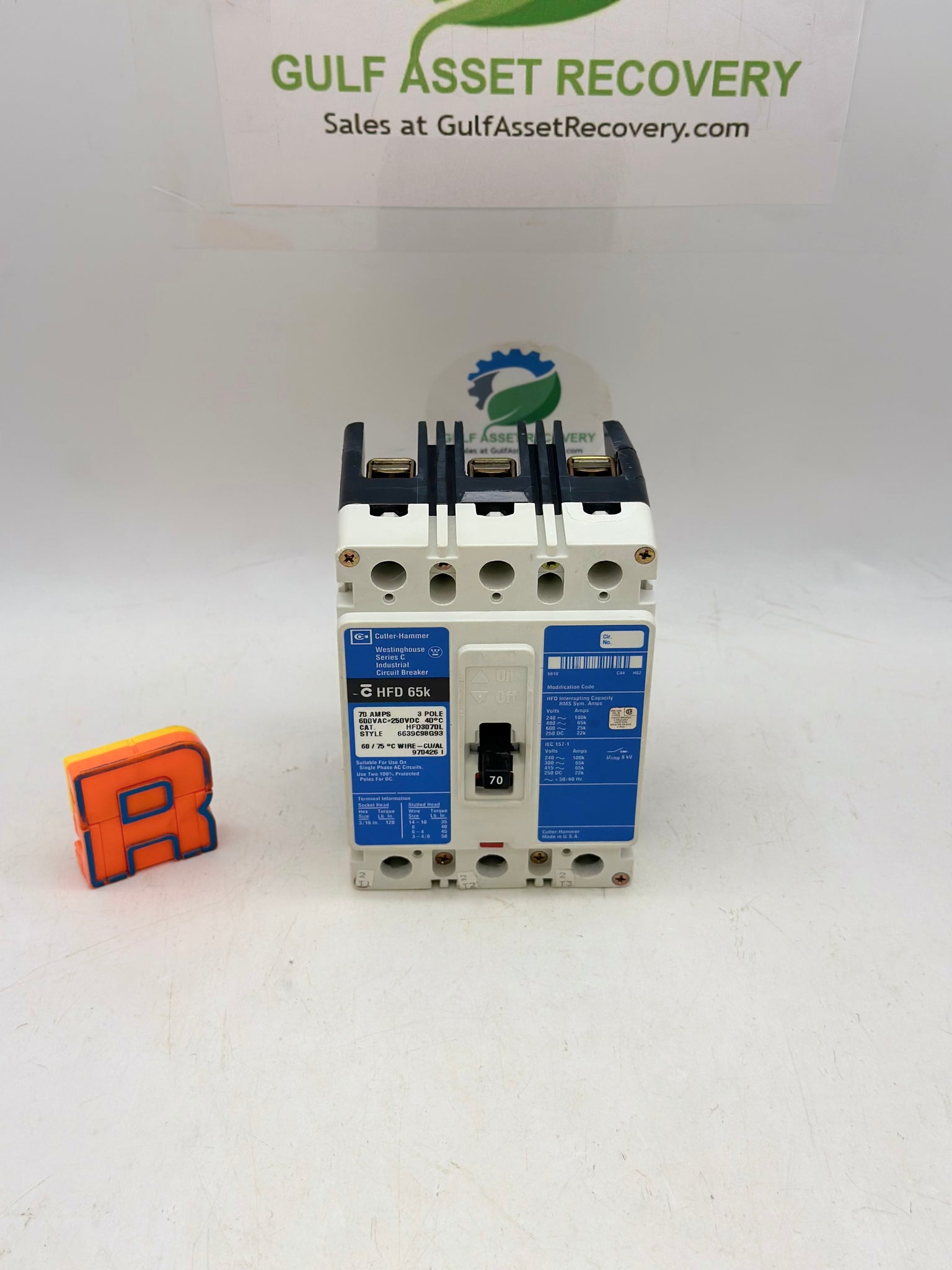 Cutler-Hammer HFD3070L Circuit Breaker, 70A, 3-Pole, 600VAC-250 VDC, Used-Frame Bent on Top Right Plastic Fin But Unit Still Functions Properly-See Pictures