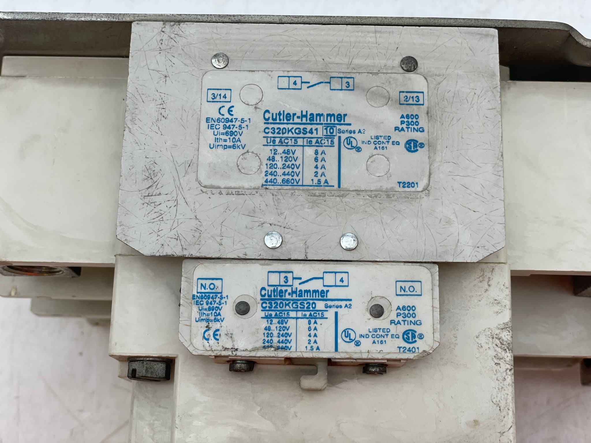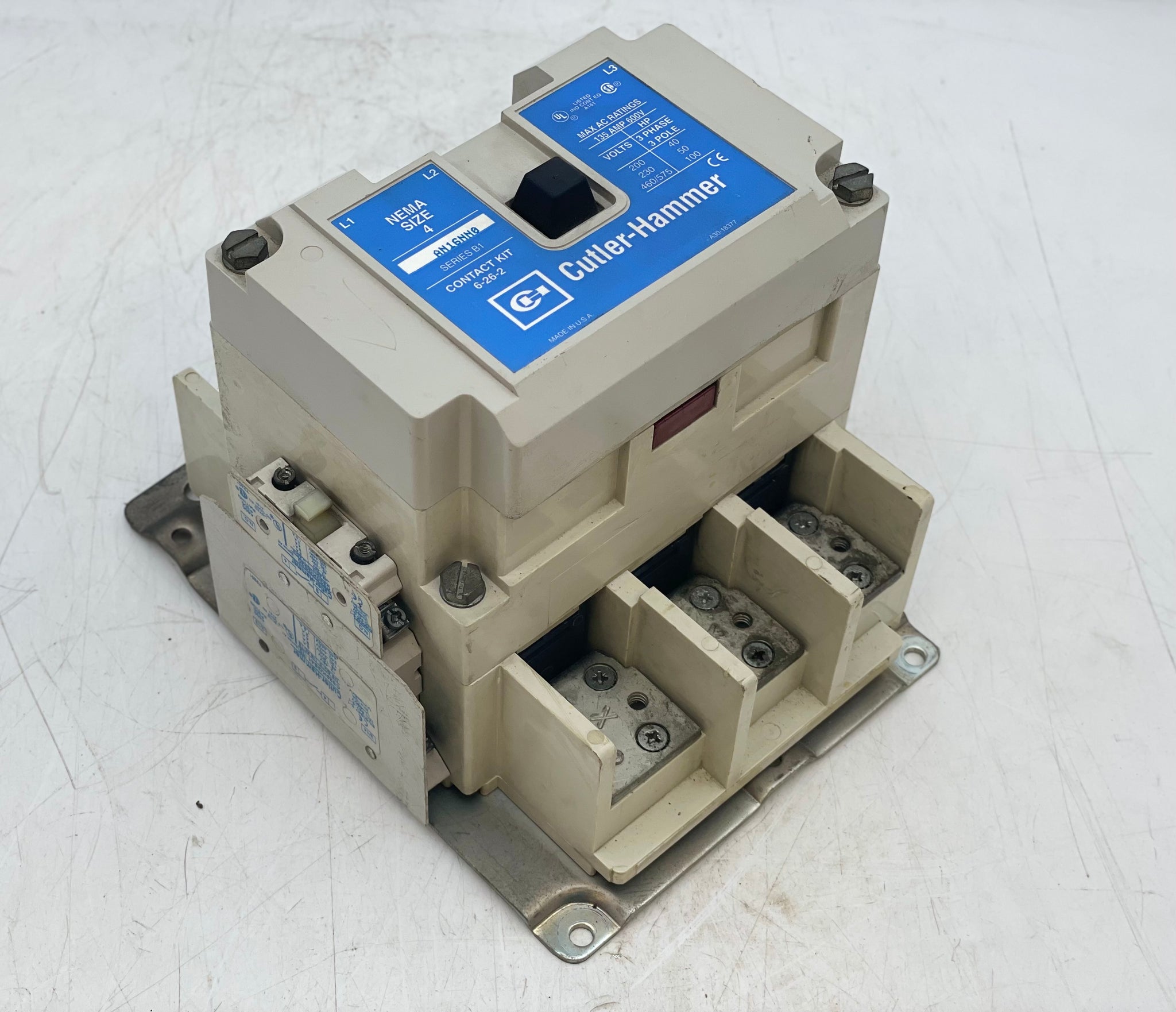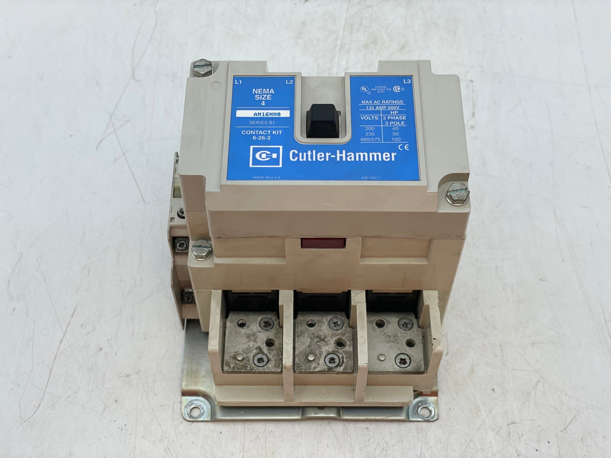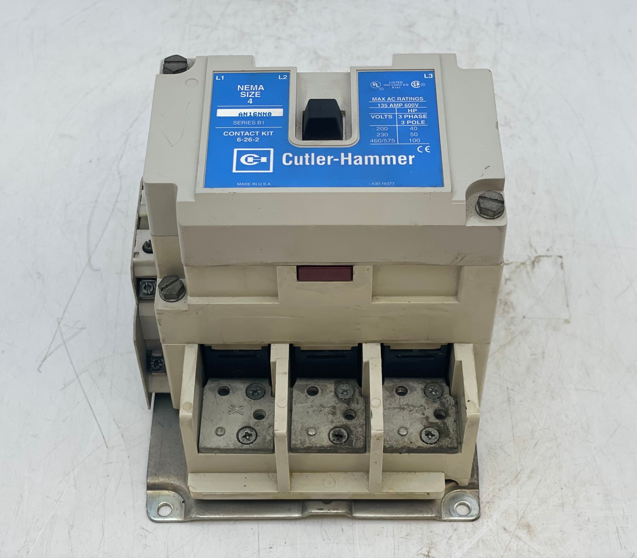 Cutler-Hammer AN16NN0A NEMA Size 4 Contactor w/ 1891-1 110/120V 50/60Hz Coil, C320KGS41 1NO Contact, C320KGS20 1NO Contact, Used-Contactor Only-No Overload Relay