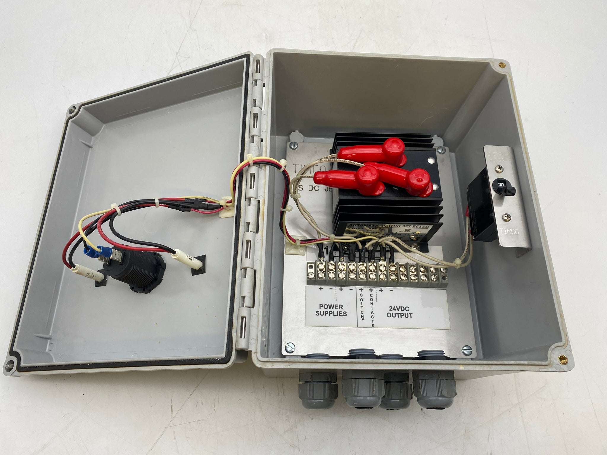 NewMar APS-70 Automatic Power Selector In Enclosure, Used-Item Is Equipped With A Blue Sea System 1733 Voltmeter On Front of Enclosure. Enclosure Is a Hoffman A1086CHSFG Type: 4,4X,12,13. NewMar APS-70 Offers Redundant Power DC Source Isolation With A Load Rating of 12-48VDC 70A-See Pictures