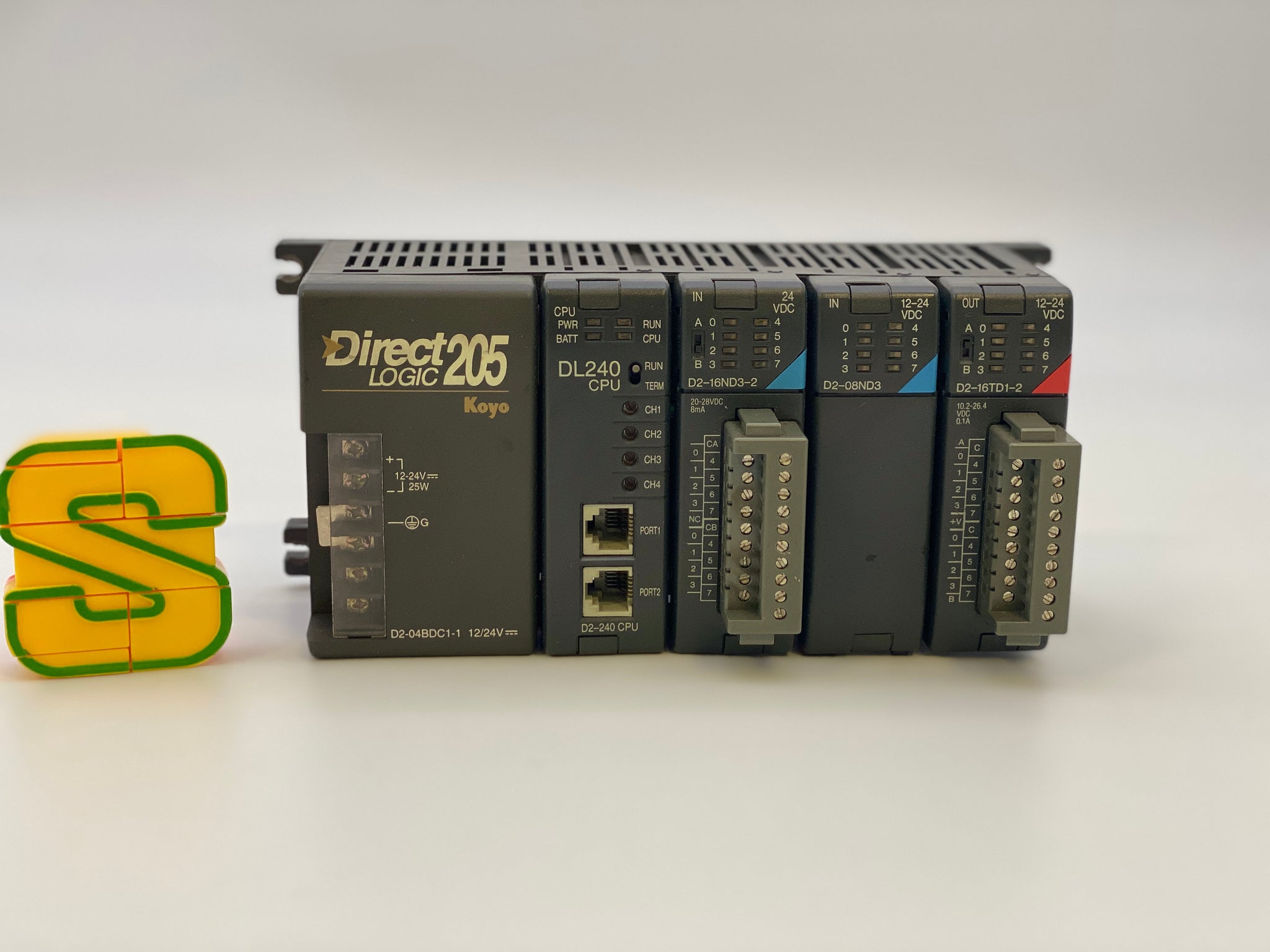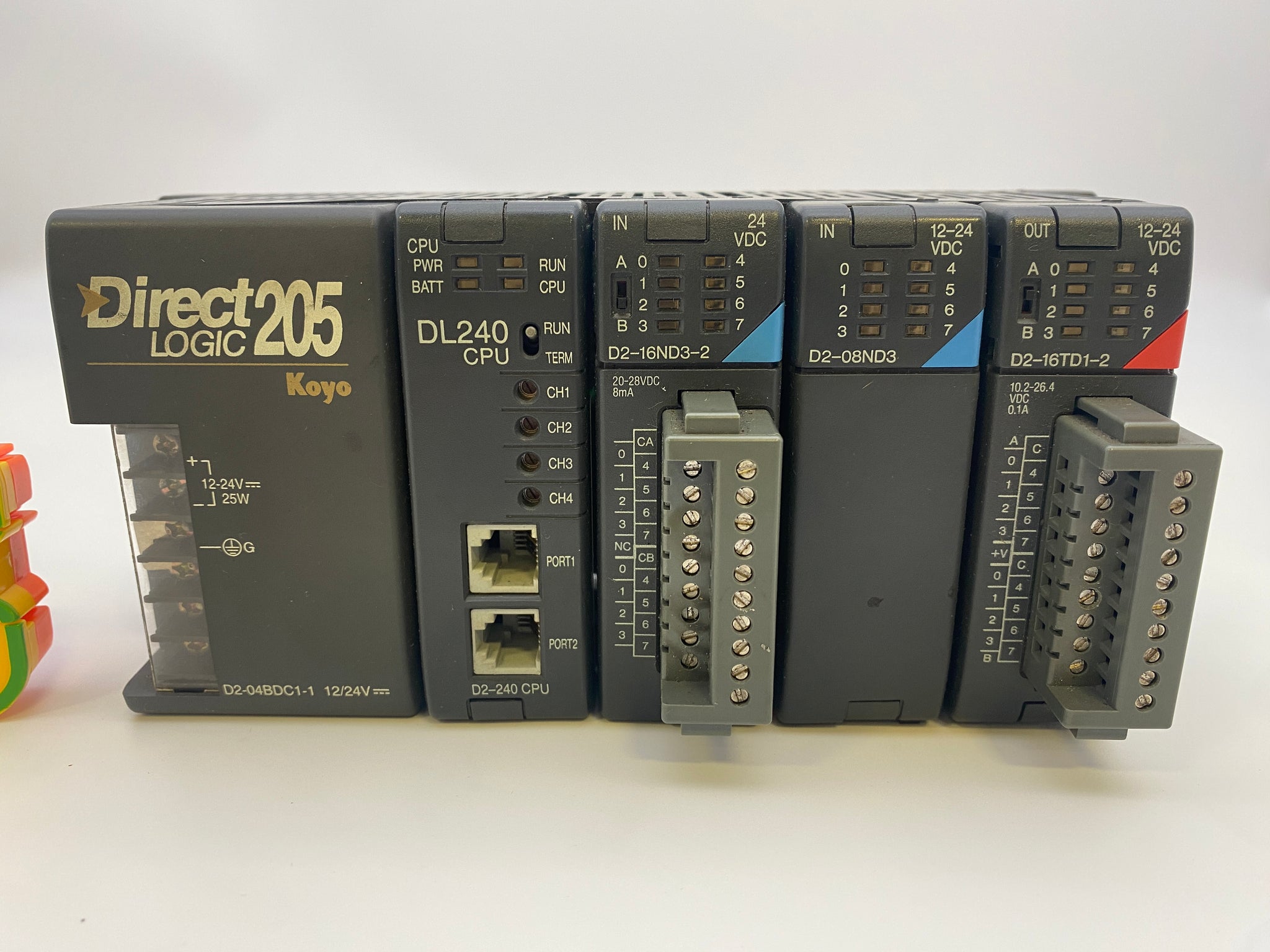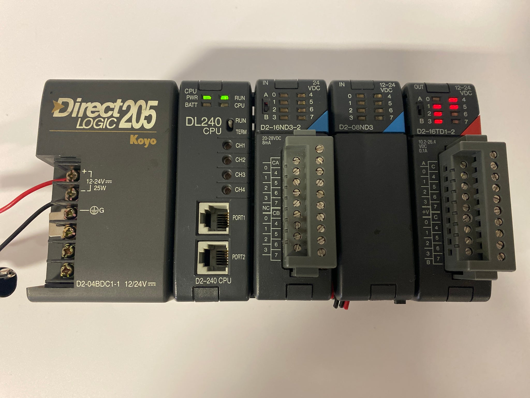 Automation Direct D204BDC1-1 DirectLogic 205 Koyo PLC Assembly w/ D2-04BDC1-1 Power Supply, D2-240CPU, D2-16ND3-2, D2-08ND3, D2-16TD1-2, Used