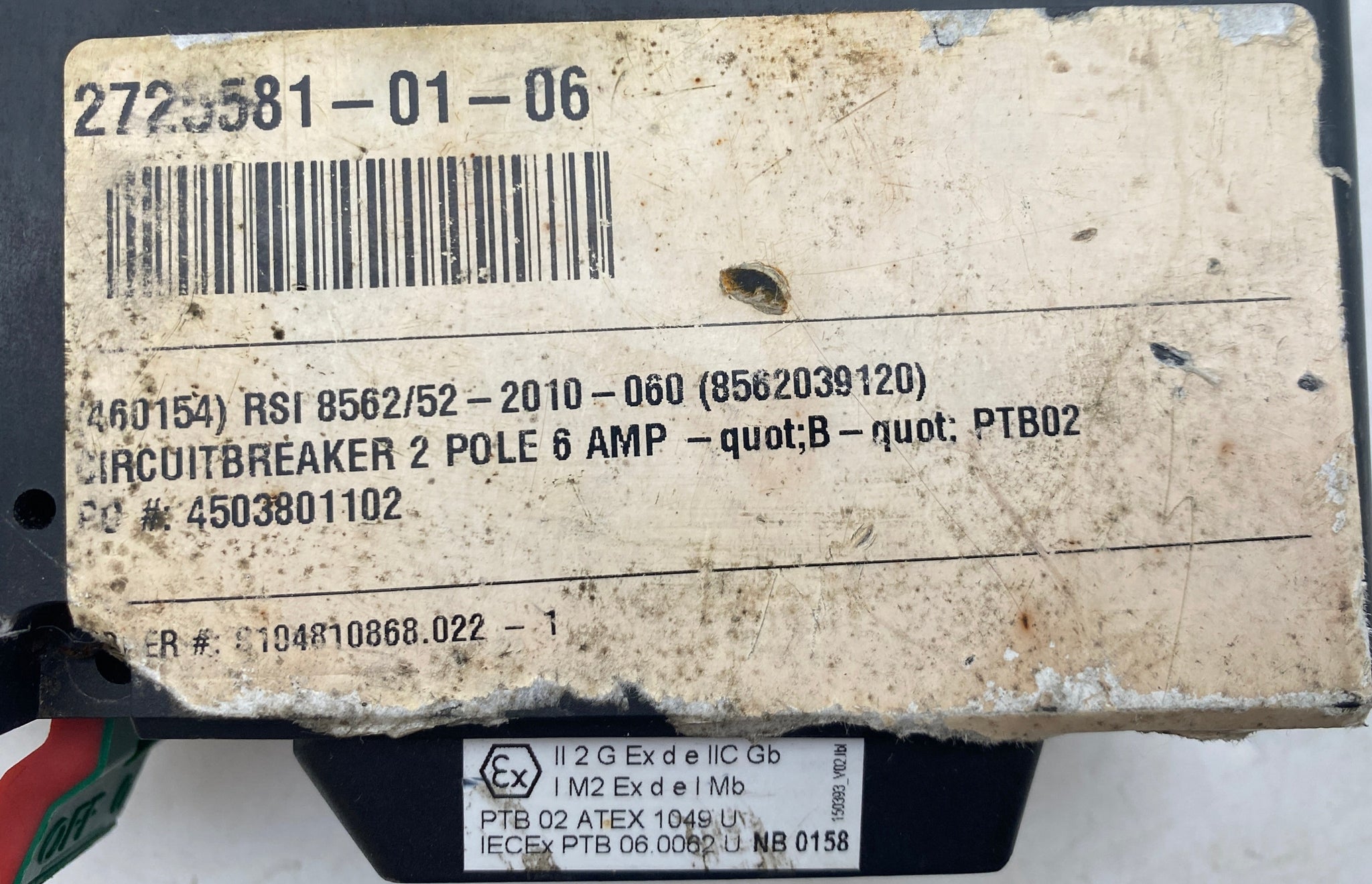 Stahl 8562/52-2010-060 Circuit Breaker, 6A, 230/400VAC 110VDC, 2-Pole, Used